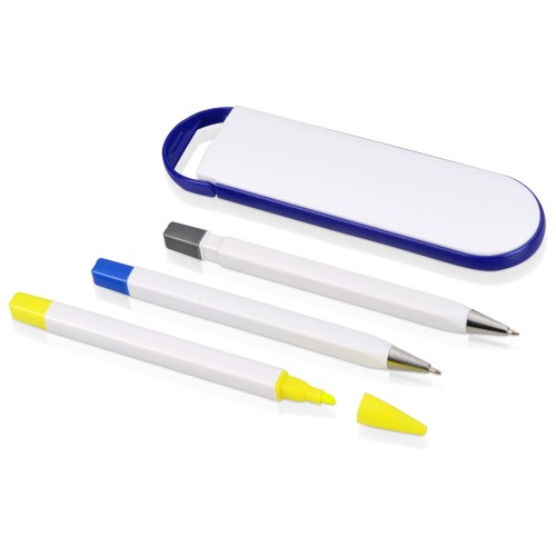Набор включает в себя шариковую ручку, маркер, карандаш и футляр. Возможность нанесения логотипа на футляр и корпус принадлежностей поможет сделать набор еще ярче.